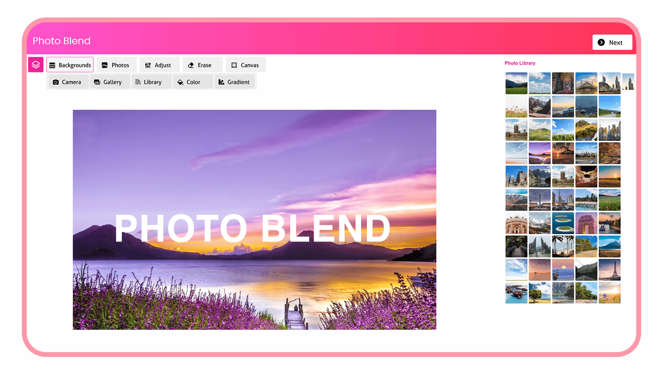 Once opened, you’ll see the main workspace with all tools and features displayed at the top — such as Backgrounds, Photos, Adjust, Erase, Canvas, and more.
