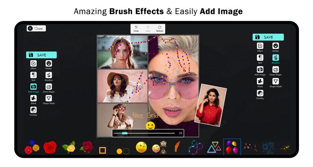 - Draw stickers using the brush tool. There are lots of amazing stickers to brush onto your collage photo, and you can also adjust the size of the brush.